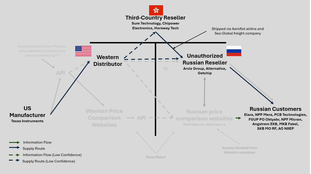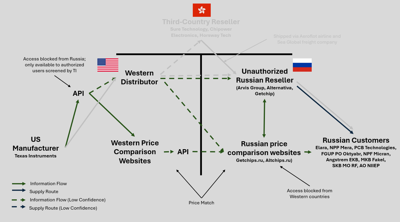 According to the Bloomberg study, the starting point for many illicit purchases is through Russian websites--in this case, getchips.ru and altchips.ru. The study explains that the pricing information on these two sites mirrors pricing information obtained directly from TI’s application programming interface (API), though TI only allows API access to entities they have previously screened and approved. It remains unclear how these sites obtained this information, though this suggests one of the approved entities may be offering this data to a third party.